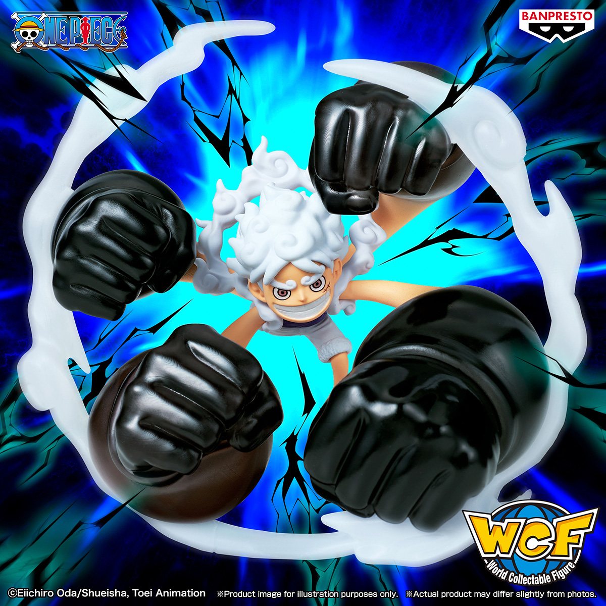 Esta figura especial de la línea World Collectable Figure presenta a Monkey D. Luffy en su poderosa forma Gear 5, ejecutando el ataque «Gum-Gum Dawn Gatling». A pesar de su tamaño compacto, la pieza está llena de detalles que capturan la energía y la acción del momento.