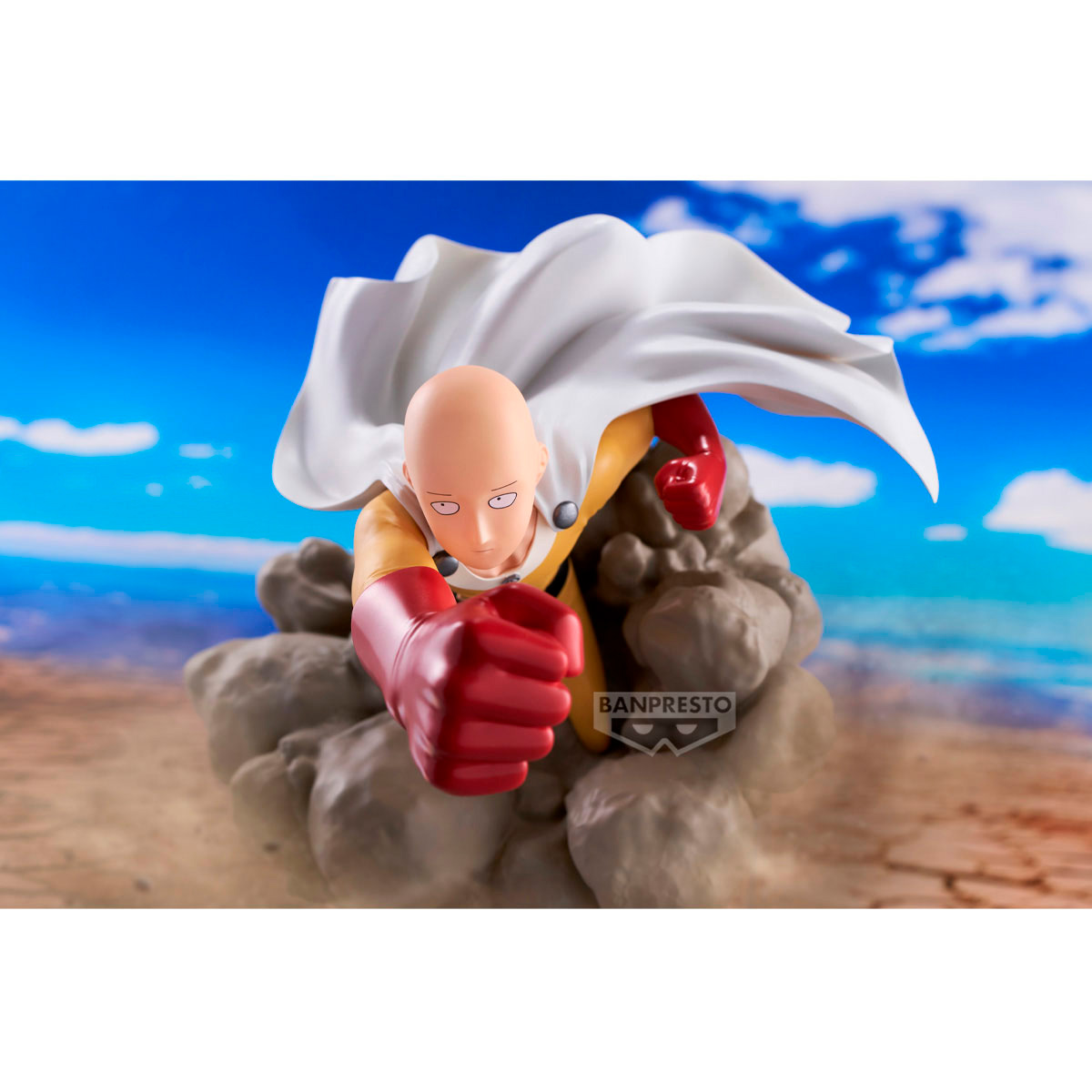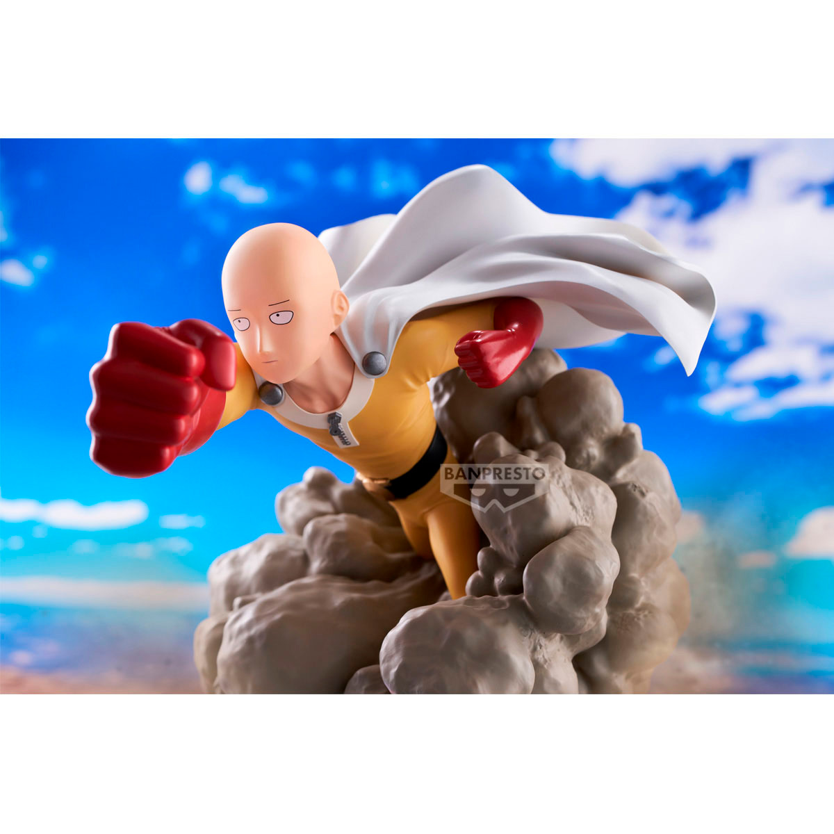 Saitama se presenta en una figura tipo diorama, capturado justo en el momento de lanzar su famoso puñetazo. La base simula el impacto de su fuerza y el diseño transmite movimiento y humor, representando perfectamente al héroe más poderoso y despreocupado del anime.