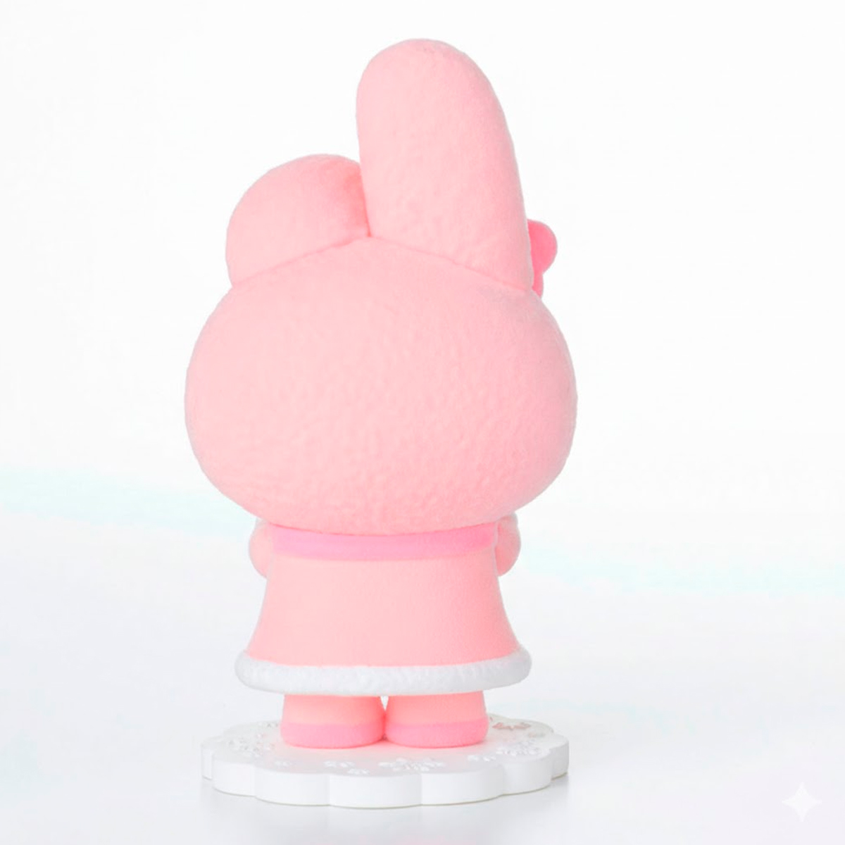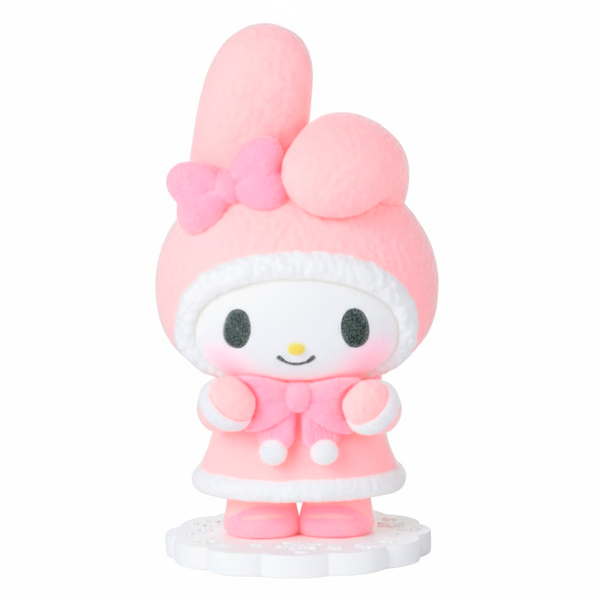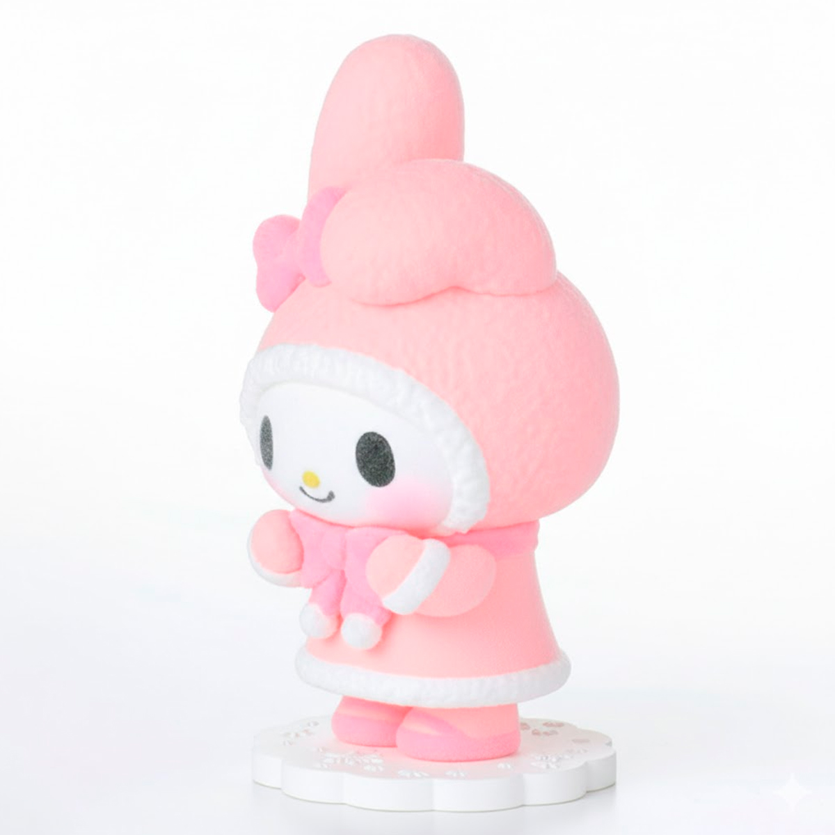 My Melody aparece en una adorable figura de acabado aterciopelado, con colores pasteles y detalles delicados que resaltan su ternura. Su textura suave y su pose dulce la convierten en una pieza especial para cualquier amante de Sanrio.