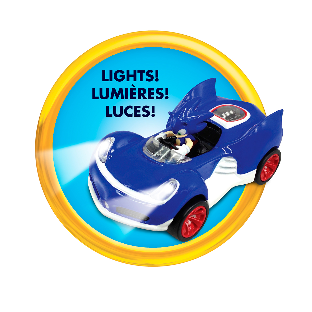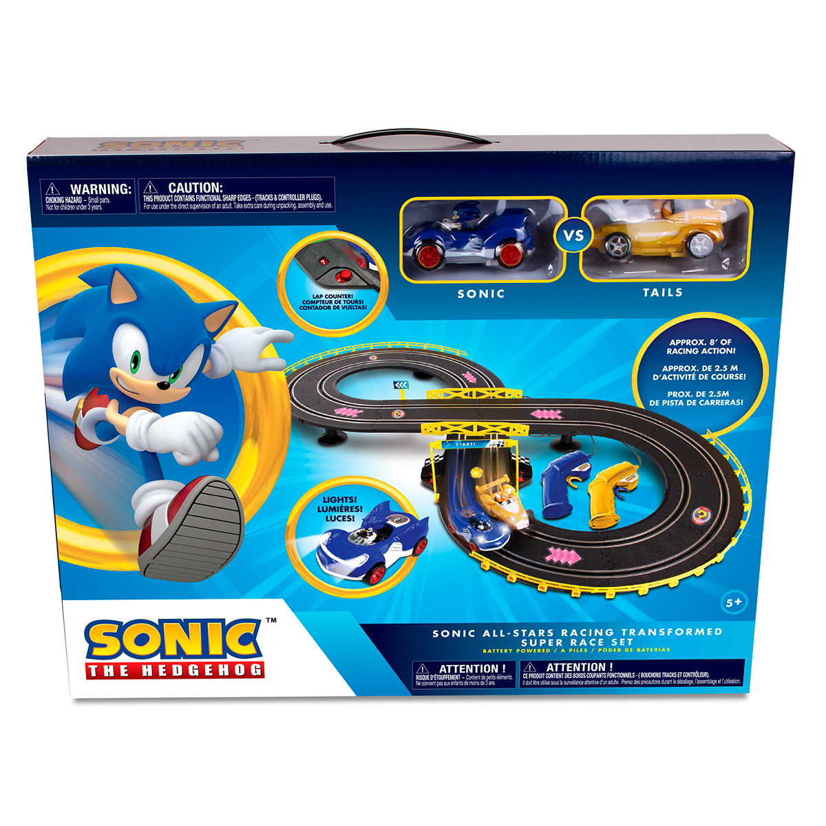 ¡Super Slot Car Race Set es de aproximadamente 8 pies de acción de carreras y cuenta con Sonic y Tails! ¡Funciona con baterías, tiene un contador de vueltas y luces! Incluye 2 vehículos, 2 controladores y 16 piezas de oruga. Requiere 3 pilas C.