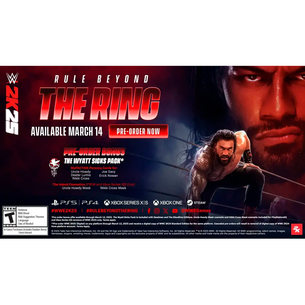 Por primera vez en la franquicia, sal de las cuerdas y entra a The Island para Xbox Series X|S/PlayStation 5, un mundo inmersivo con temática de la WWE lleno de arenas épicas, desafíos y eventos en vivo. Lucha para unirte a The Bloodline con “The Original Tribal Chief” Roman Reigns, mientras mejoras y personalizas a tu MySUPERSTAR a través de múltiples capítulos de la historia.